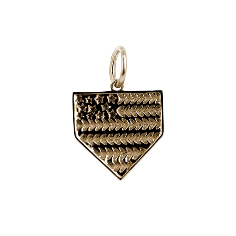 Available in tarnish-resistant sterling silver (0.925) or 14K yellow and white gold, the charm is shaped like a baseball home plate diamond. Inside the plate, a unique baseball-inspired American flag design is carefully crafted, with alternating baseball stitches forming the stripes. This creative detail makes the piece instantly recognizable while showcasing its exclusive All In Faith design.