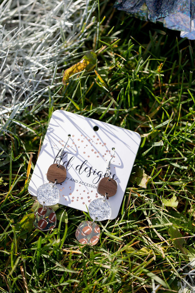 Football earring with wood printed top and acrylic pieces