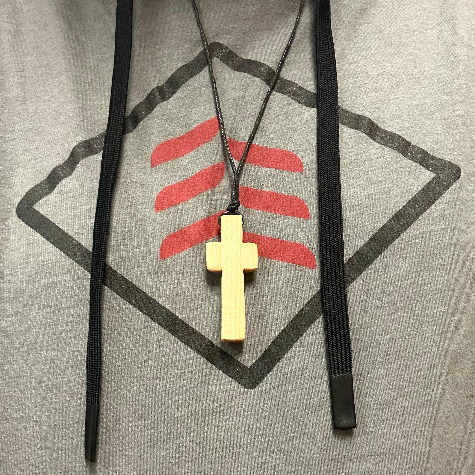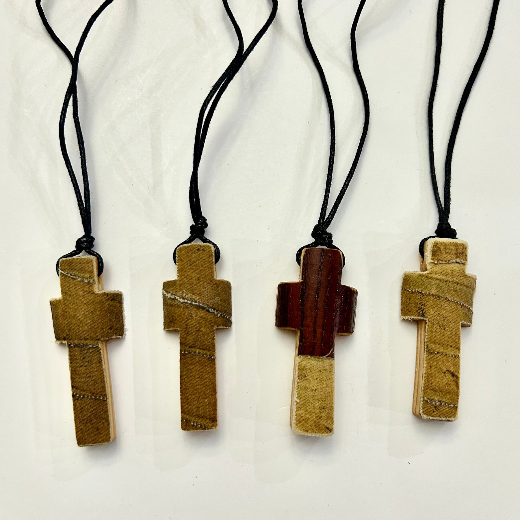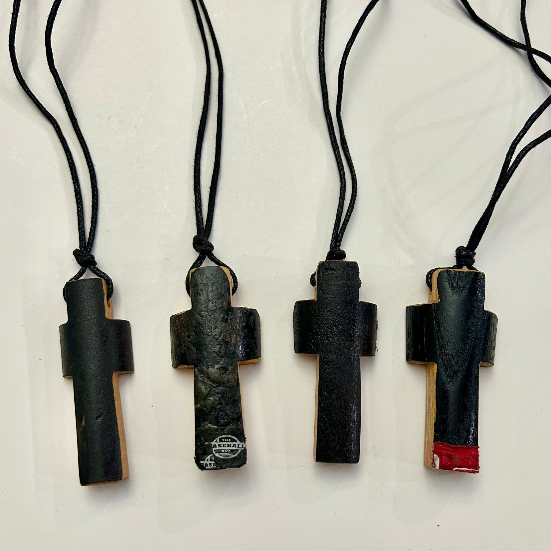 Product Description: This product listing is for ONE cross necklace that was carved from bat handles of broken wood baseball bats. Each cross is approximately 1” high; each being uniquely different. The necklace is an adjustable 14" long black wax cotton cord. Multiple cross necklaces are pictured to show the unique variations of color and appearance. Some still have bat handle tape still wrapped around them, while others are a blend of different bat colors (red, brown, black, and white). With each cross being uniquely different, we’ve separated the crosses by color and style to give you more control over the type of cross you’d like to receive.